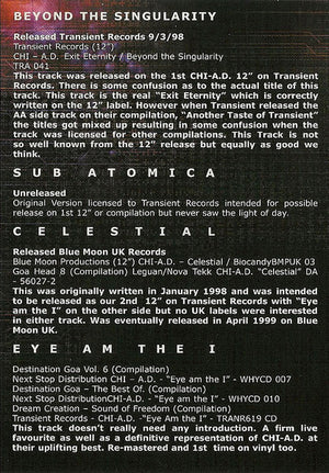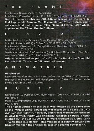 The booklet inside contains information about each track, being it were and when originally track was released, the compilation appearances it made and the samplers, synthesizers, modules and software used. Track 6 is named "C.12" on back cover but correctly named inside. Design @ Cosmic Circus / Layout: CF @ Visions