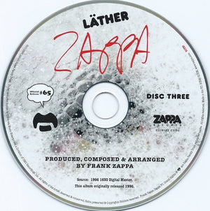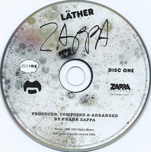 Released in a 8-panel Digisleeve. Includes a booklet with liner notes in English. This album was originally released in 1996. All compositions controlled worldwide by the Zappa Family Trust, dba Munchkin Music. ©℗ 1996, mmxii Zappa Family Trust. Under exclusive license to Universal Music Enterprises, a Division of UMG Recordings, Inc. Made in the EU. Zappa, Frank Zappa, FZ, Grand Rigts & the "moustache" are ZFT registered marks. This is Zappa Family Archival Matter In Living Ylem. Source: Original 1996 1630 Digital Master. This is official release #65. Producer - FZ, Record Plant, Los Angeles. Läther was originally conceived by Zappa as a 4-record box set (the material was recorded 1973-1977) that was rejected by his record company in early 1977. Most of the compositions were re-edited (sometimes with other arrangements) over the next two years into several albums (principally Live In New York, Studio Tan, Sleep Dirt, & Orchestral Favorites). The project was released only in 1996. Special Thanks for all Good Will expressed by various members of the FZ Teen-age Audience & Support Team and for hot duty: Ahmet Zappa for Target Acquisition & Owen Sloane, Larry Stein, Antonio, Mike, Joe & Melanie, without all of whom the possible is horribly foreshortened. Very Special Thanks to Moon • Dweezil • Ahmet • Diva - Mathilda, Zola, Ceylon & Halo.