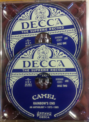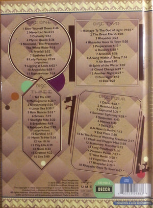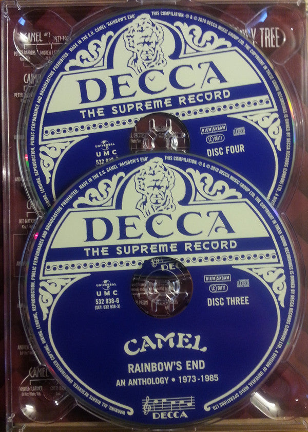 Tracks taken : 1-1 to 1-4 from album /master/33556Camel. Released as MCA Records MUPS 473 in February 1973. 1-5 to 1-7 from album /master/33559Mirage. Released as Deram SML 1107 in March 1974. 1-8 from the same recording sessions of LP "Mirage" (1974) and previously unreleased. [not mentioned in the booklet 1-9 & 1-10 from BBC Radio One "In Concert" and previously unreleased. 1-11 & 2-1 previously unreleased. 2-2 to 2-4 from album /master/33562Music Inspired By The Snow Goose . Released as Decca SKL-R 5207 in April 1975. 2-5, 2-6, 2-12, 3-2 to 3-5 from the album /master/27426A Live Record. Released Decca DBC-R 7/8 in April 1978. [source is only mentioned in the booklet for track 3-4. 2-7 to 2-10 from the album /master/33568Moonmadness. Released as Decca TXS-R 115 in March 1976. 2-11 from the 2002 reissue 2CD of "A Live Record" as bonus track. 2-13 to 3-1 from the album /master/33573Rain Dances. Released as Decca TXS-R 124 in September 1977. 3-6 to 3-8 from the album /master/33629Breathless. Released as Decca TXS-R 132 in September 1978. 3-9 B-side of single. Released as /master/678407Decca F-R 13879 in October 1979. Alternate version featured on the album /master/33629Breathless. 3-10 to 3-12 from the album /master/33644I Can See Your House From Here. Released as Decca TXS-R 137 in October 1979. 3-13 to 3-16 from the album /master/33650Nude (1981). [not mentioned in the booklet. 4-1 to 4-4 previously unreleased 4-5 to 4-9 from the album /master/33671The Single Factor. Released as Decca SKRL 5328 in May 1982. 4-10 first released in January 1985 on the soundtrack of /master/33658Pressure Points VHS video. Later released on the 2009 reissue CD of /master/33666Stationary Traveller as bonus track. 4-11 to 4-13 from the album /master/33666Stationary Traveller. Released as Decca SKL 5334 in 1984. 4-14 to 4-18 from the album /master/33658Pressure Points. Released on Decca SKL 5338 in November 1984. Tracks recorded at : 1-1 to 1-4 at Morgan Studios, London 1-5 to 1-8 at Island Studios, London, and Studio 2 Decca Studios, London. Mixed at AIR Studios, London 1-9 & 1-10 live at Golders Green Hippodrome, London, June 6, 1974 1-11 & 2-1 live at Marquee Club, London, October 30, 1974. Mixed at The Audio Archiving Company, London, in November 2001 2-2 to 2-4 at Island Studios, London, and Decca Studios, London. 2-5 & 2-6 live at Royal Albert Hall, London, October 17, 1975 2-7 to 2-10 at Island Studios, London 2-11 & 2-12 live at Hammersmith Odeon, London, April 14, 1976. Mixed at The Audio Archiving Company, London, in December 2008 2-13 to 3-1 at Basing Street Studios, London, February–August 1977 ( Wikipedia ) 3-2, 3-3 and 3-5 live at The Colston Hall, Bristol, UK, October 2, 1977. Mixed at The Audio Archiving Company, London, in December 2001 3-4 live at The Colston Hall, Bristol, UK, October 2, 1977 3-6 to 3-9 at: The Manor Studios, Oxfordshire, UK, Chipping Norton Studios, Oxfordshire, UK, and Threshold Studios, London 3-10 to 3-12 at Farmyard Studios, Little Chalfont, UK in 1979 ( Wikipedia ) 3-13 to 3-16 at Abbey Road Studios ( Studio 3 ), London, in September 1980 4-1 to 4-4 live at Hammersmith Odeon, London, February 27, 1981, for BBC Radio One " In Concert " programme 4-5 to 4-9 at Abbey Road Studios ( Studio 3 ), London, in January / February 1982 4-10 to 4-13 at Riverside Studios, London 4-14 to 4-18 live at Hammersmith Odeon, London, May 11, 1984. Mixed at Trilion Studios, London, August 1984 Remastered in June 2010. Additional analogue to digital transfers at The Audio Archiving Company, London. Project managed by Joe Black for Universal Music Catalogue It includes booklet of 38 pages with black & white / colour photos and extended liner notes. This Compilation: ℗ 2010 Decca Music Group Ltd. © 2010 Decca Music Group Ltd. The copyright in these sound recordings is owned by Decca Records (London) Ltd., a division of Universal Music Operations Ltd. Made in the E.U. Tracks 1-1 to 1-4 ℗ 1973 MCA Records Inc. Tracks 1-5 to 1-7 ℗ 1974 Gama Records Ltd. Tracks 1-8, 1-11, 2-11, 2-12, 3-2, 3-5 ℗ 2002 Decca Music Group Ltd. Tracks 1-9, 1-9 ℗ 1974 BBC Music. Track 2-1 ℗ 2001 MCA Records Inc. Tracks 2-2 to 2-4 ℗ 1975 Decca Music Group Ltd. Tracks 2-5, 2-6 ℗ 1978 Decca Music Group Ltd. Tracks 2-7 to 2-10 ℗ 1976 Decca Music Group Ltd. Tracks 2-13, 2-14, 3-1, 3-3 ℗ 1977 Decca Music Group Ltd. Tracks 3-4, 3-6 to 3-9 ℗ 1978 Decca Music Group Ltd. Tracks 3-10 to 3-12 ℗ 1979 Decca Music Group Ltd. Tracks 3-13 to 3-16 ℗ 1981 Decca Music Group Ltd. Tracks 4-1 to 4-4 ℗ 1981 BBC Music Tracks 4-5 to 4-9 ℗ 1982 Decca Music Group Ltd. Tracks 4-10 to 4-18 ℗ 1984 Decca Music Group Ltd. Publishers: Tracks 1-1, 1-2: RAK Publishing Ltd. Tracks 1-3, 1-10, 2-1: Concorde International Management Ltd. Tracks 1-6, 1-9, 1-11: Kenmar Music Co. Tracks 1-7, 1-8, 2-4 to 2-6, 2-8, 2-11 to 2-13, 3-1, 3-2, 3-4, 3-9: Kenmar Music Co. / RAK Publishing Ltd. Tracks 2-14, 3-10 to 3-12, 3-14, 4-2, 4-3, 4-5, 4-7, 4-9 to 4-16: Latimer Music Tracks 3-3, 3-6, 3-8: Kenmar Music Co. / Latimer Music / Ward Music Tracks 3-5, 3-7: Kenmar Music Co. / Latimer Music Track 3-13, 3-15, 3-16, 4-9: EMI Songs Ltd. / Latimer Music Track 4-1: Concorde International Management Consultants Ltd. / Latimer Music Track 4-4: Latimer Music / Sparta Florida Music Group Ltd. Track 4-8: April Music Ltd. / Latimer Music Tracks 4-17, 4-18: Conexion Music Ltd. / RAK Publishing Ltd. For some tracks no publishers was mentioned.