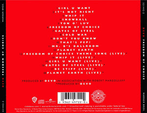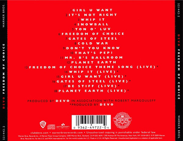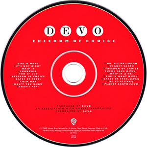 © ℗ 2009 Warner Bros. Records Inc. for the U.S. and WEA International Inc. for the world outside the U.S. Made in U.S.A. Released in a jewel case with clear tray and a 16-page stapled booklet. Tracks 13-18 are bonus tracks to this reissue. Some copies with sticker on front: "The 1980 definitive and pioneering DEVO release that inspired an international New Wave movement. One of the most important and recognizable post punk albums ever produced in contemporary American music. Remastered from the original analog tapes includes "DEV-O LIVE" EP with Girl U Want, Whip It, and Gates Of Steel. Original album also available on limited edition red vinyl" Some copies come with in-lay card advertising limited edition vinyl, and CD versions for both "Freedom of Choice" and "Q. Are We Not Men? A. We Are Devo" that can only be found at clubdevo.com. All songs © 1980 Devo Music/EMI Virgin Songs Inc. - BMI Tracks 1 to 12: Recorded at The Record Plant, Los Angeles Tracks 13 through 18: Recorded at the Fox Warfield, San Francisco, CA - August 16, 1980. Originally recorded for the King Biscuit Flower Hour.