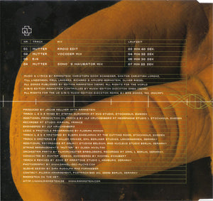 All songs published by Edition Rammstein (GEMA). All rights for the world O/B/O Edition Rammstein controlled by Musik-Edition Discoton GmbH (GEMA). All rights for US O/B/O Musik-Edition Discoton admin. by BMG Songs, Inc. (ASCAP). Track 1, 2 & 3 mixed at MVG Studio Stockholm, Sweden. Additional production on track 2 at Megaphone Studio 1, Stockholm, Sweden Recorded at Studio Miraval, France. Track 1, 2 & 4 Mastered at the Cutting Room, Stockholm, Sweden. Track 3 Mastered at Emil Berliner Studios, Langenhagen, Germany Additional recordings at Galaxy Studios Belgium, and Nucleus Studio, Berlin, Germany Orchestra parts recorded at Saal 1, Berlin. Track 4 remixed at Maratone Studio 1, Hamburg, Germany. ℗ & © 2002 Motor Music, Hamburg Made in the EU.