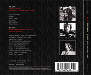 3-panel fold-out digipak. Includes a 20-page booklet. Some packages have a sticker on shrink warp 40th Anniversary Edition 2CD Deluxe Edition 2015 Album Remaster On CD For The First Time Permanent Waves World Tour 1980 12 Unreleased Live Performances Designed By Hugh Syme With Unreleased Illustrations And Photos 00602508607226 Sticker states 12 Live Performances, but CD-2 only contains 11 tracks 'A Passage To Bangok' is missing since it was already included on the '2112 Deluxe Edition'. The track is included on the vinyl edition though.