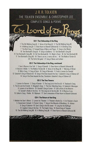 Inclusive 112 Page Booklet GB/D Roles: Christopher Lee (Narrator & Treebeard) Peter Hall (Frodo, Sam & Tom Bombadil) Nick Kier (Bilbo) Ulrik Cold (Gandalf) Morten Ernst Lassen (Aragon & Éomer) Kurt Ravn (Legolas) Signe Amussen (Galadriel) Mads Thiemann (Ent) Casper Reiff (Merry) Tom McEwan (Pippin) Jörgen Ditlevsen (Gimli, Bregalad & Eagle) Ole Norup (Gildor) Malene Nordtorp Windekilde (goldberry) Povl Dissing (Gollum) The Tolkien Ensemble (founded in 1995) is a Danish ensemble which aims to create "the world's first complete musical interpretation of the poems and songs from The Lord of the Rings". They published four CDs from 1997 to 2005, in which all the poems and songs of The Lord of the Rings are set to music. The project was approved by both the Tolkien family and HarperCollins Publishers. Queen Margrethe II of Denmark gave permission to use her illustrations in the CD layout. The release of the four-CD-box marks the end of more than ten years work and, with the participation of more than 150 professional musicians, The Tolkien Ensemble finally reached their goal: the release of their Complete Songs & Poems from The Lord of the Rings.[6 The four-CD-box is dedicated to the memory of J.R.R. Tolkien, to The Tolkien Society in Oxford and to the millions of people for whom The Lord of the Rings has a special place in their hearts.