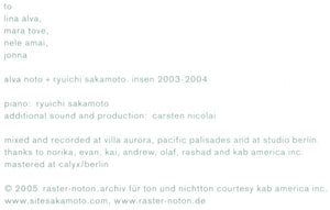 alva noto + ryuichi sakamoto. insen 2003-2004 mixed and recorded at villa aurora, pacific palisades and at studio berlin. thanks to norika, evan, kai, andrew, olaf, rashad and kab america inc. (c) 2005 raster-noton. archiv für musik und nichtton, courtesy kab america inc. www.sitesakamoto.com, www.alvanoto.com, www.raster-noton.net raster-noton. archiv für musik und nichtton 2010 Digipak packaging.
