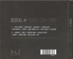 HDBCD048 Tunes by Burial, London 2011-2019. www.hyperdub.net 2xCD compilation of previously released material in book-style double Digipak. 1-1 and 1-8 originally released as 12"/digital files in 2019: 1564590 1-2 and 1-3 originally released as 10"/digital files in 2017: 1182270 1-4 and 1-5 originally released as 12"/digital files in 2016: 1097102 1-6, 1-7, and 1-9 originally released as 12"/CD/digital files in 2013: 629681 2-1, 2-2 and 2-3 originally released as 12"/digital files in 2012: 409566 2-4 and 2-5 originally released as 12"/CD/digital files in 2012: 501116 2-6, 2-7 and 2-8 originally released as 12"/digital files in 2011: 323648 2-1, 2-2, 2-3, 2-6, 2-7 and 2-8 have also been previously compiled for the Japanese market as CD [r=3429788. Misprint information: The Digipak tracklist gives 1-8 as Rival Dealer, and 1-9 as Claustro, however this is incorrect. The disc actually matches the web edition in having Claustro at 1-8, and Rival Dealer at 1-9. Copies ordered from the label's Bandcamp page came with a 4x4-inch 'Burial' logo sticker. At 4:49 minutes the track "Nightmarket" contains a sample from the Commodore 64 game "The Last Ninja 2 (The Mansion)" originally composed by [a60931
