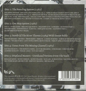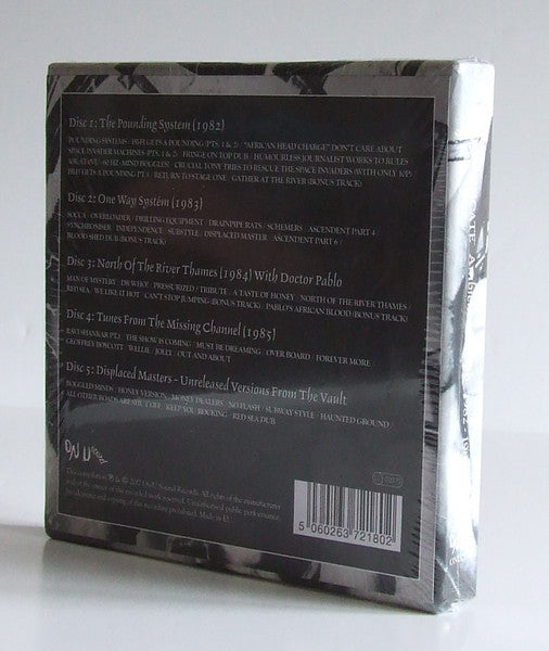 CD1: The Pounding System Another 1992 On-U Sound Production Originally released in 1982 as ONULP18 Recorded at The Manor Mixed at Berry St. Mastered at Utopia ℗ 1982 On-U Sound Bonus track "Gather At The River" first issued as part of the Japanese only Dub Syndicate [r=3297558 in 2011, an alternate version of "Fringe On Top Dub" CD2: 331672 Another 1993 On-U Sound Production Originally licensed to ROIR International and released in 1983 on cassette as A121 Recorded at Berry St., Channel One and Southern Studios Mixed at Berry St. and Southern Studios Front re-imaging by Jaffa at The Unknown based on the original cassette design. ℗ 1983 On-U Sound Bonus track "Blood Shed Dub" originally credited to [a132585 with [a40537 as issued as part of the On-U Sound Disco Plate series in 1983 (ONUDP8), using the same rhythm as the "Ascendents (Parts 4 & 6)" from One Way System. CD3: 19309 Another 1994 On-U Sound Production Originally released in 1984 as ONULP30 Recorded & mixed at Berry St. & Southern, Dec.'82 - Jan.'84. Mastered at Utopia ℗ 1984 On-U Sound Bonus track "Can't Stop Jumping" originally credited to Bim Sherman & Dub Syndicate and issued as part of the On-U Sound Disco Plate series in November 1983 (ONUDP10). [Bonus track "Pablo's African Blood" is a melodica version of "African Blood from ONUDP8, and was first heard in this incarnation on the Japanese CD reissue of [r=2288971 in 2005. CD4: 19350 Another 1995 On-U Sound Production Originally released in 1985 as ONULP38 Recorded at Southern Studios, London, Berry St. London and Studio Prisme, Lausanne, Switzerland Mixed at Southern Studios ℗ 1985 On-U Sound CD5: 1273710 All tracks previously unreleased, recorded between 1982 and 1985 at Berry Street, Southern Studios and Channel One 5-1 is a version of 1-6 5-2 is a version of 3-5 5-3 is a version of 4-5 5-4 is a version of 2-1 5-5 is a version of 2-9 5-6 is a version of 'Haunting Ground' from [r=1078700, 1986 5-7 is a version of 'No Alternative' (But To Fight)' from 54069, 1988 5-8 is a version of 3-9 5-9 is a version of 3-7 Mastered at Ten Eight Seven Mastering Front cover design by Jaffa at The Unknown Boxset layout & design and original sleeve restoration by Jools Williamson at ED&P Ltd This compilation ℗ & © 2017 On-U Sound Records. Made in EU. Some credits differ following albums: Lizard is credited Lizard Logan in CD1 & CD5's credits section, Lizard in CD2. Crucial Tony is credited Crucial Tony in CD1 & CD4's credits section, Crucial in CD2. Bonjo I is credited Bonjo 1 in CD1's credits section, Bonjo in CD2. Eskimo Fox is credited Eskimo in CD1's credits section, Eskimo Fox in CD2, Fox in CD3. Kevin Metcalfe is credited Kevin Metcalfe in CD1's credits section, Kevin "Herbstalk" Metcalfe in CD3. Martin Frederix is credited, for guitar, as Frederix in CD3's credits section, Martin Frederix in CD4 & CD5. Congo Ashanti Roy is credited, for guitar, as Ashanti in CD2 & CD3's credits section, as Ashanti Roy in CD4. Evar Wellington is credited as Evar in CD3 & CD4's credits section, Evar Wellington in CD5. Bingy Bunny is credited Bingy in CD2's credits section, Bingy Bunny in CD5. Kishi Yamamoto is credited, for keyboards, Kishi in CD3 & CD4's credits section, Kishi Yamamoto in CD5. Doctor Pablo is credited, for keyboards and melodica, Dr. Pablo in CD3 and CD4's credits section, Doctor Pablo in CD5.