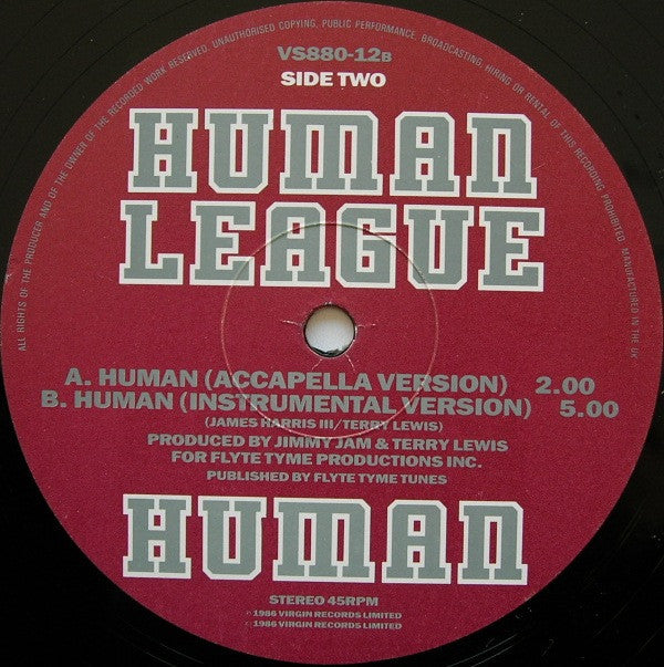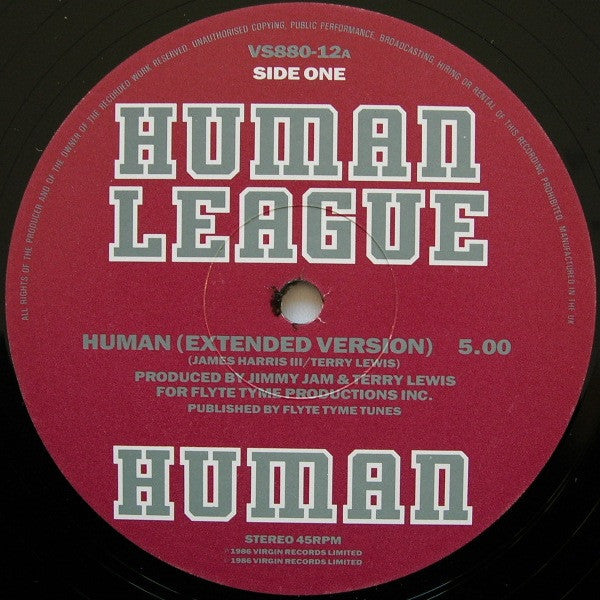 Produced for Flyte Time Productions Inc. ℗ 1986 Virgin Records Limited © 1986 Virgin Records Limited Manufactured in the UK. Designations on the actual record are "Side One" and "Side Two", with the tracks on side two listed as A and B. In runouts, JA is etched, the remainder is stamped.