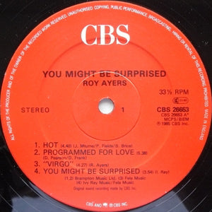 ℗© 1985 Publishers: A1, A2, B1, B4 - Brampton Music Ltd. A3, A4, B3 - Fela Music A4 - Ivy Ray music B2 - Argerie Music / Metcen Music /Syrene Music B3 - Divad Snibbor Music Roy Ayers Fan Club: PO BOX 1219 N.Y.C. N.Y. 10023 U.S.A 212 / 678-4300 Roy Ayers plays Deagan Commander 11594 Vibraharp Tawatha and Mtume appear courtesy of Epic Records Made in England Shorepak by Shorewood Packaging Co. Ltd, England. Some versions of this release have, on the front cover, the words You Might Be Surprised printed in gold, rather than the same white used to display the words Roy Ayers.