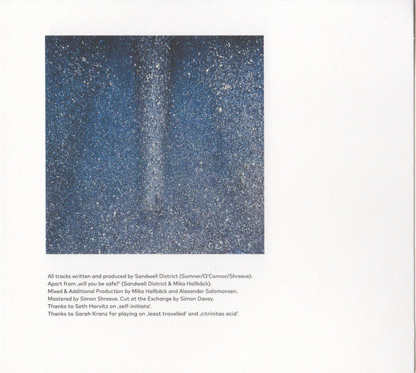 [On inner panel, left: All tracks written and produced by Sandwell District (Sumner/O'Connor/Shreeve). Apart from ,will you be safe?' (Sandwell District & Mika Hallbäck). [... Cut at the Exchange by Simon Davey. Thanks to Seth Horvitz on ,self-initiate'. Thanks to Sarah Kranz for playing on ,least travelled' and ,citrinitas acid'. [On inner panel, right: Thanks ~ Rich Machin and [a190551. [On back: Dedicated to John Mendez. p & c 2025 Point of Departure. Published by EPM/Just Isn't Music. Issued in a 4-panel cardboard sleeve. Hype sticker affixed to the shrink wrap.